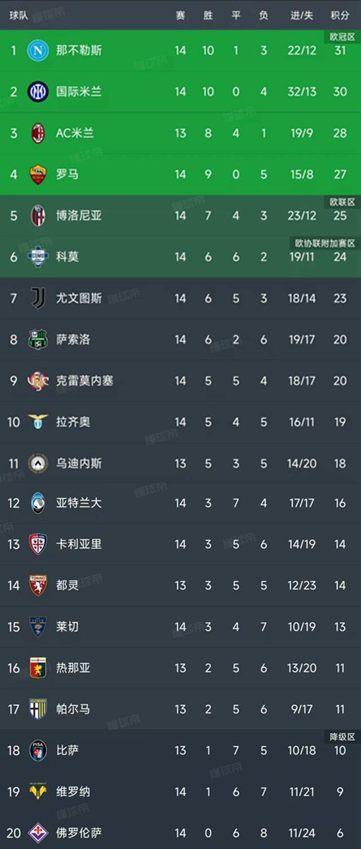 意甲第14轮结束了7场比赛,最新积分榜如下!